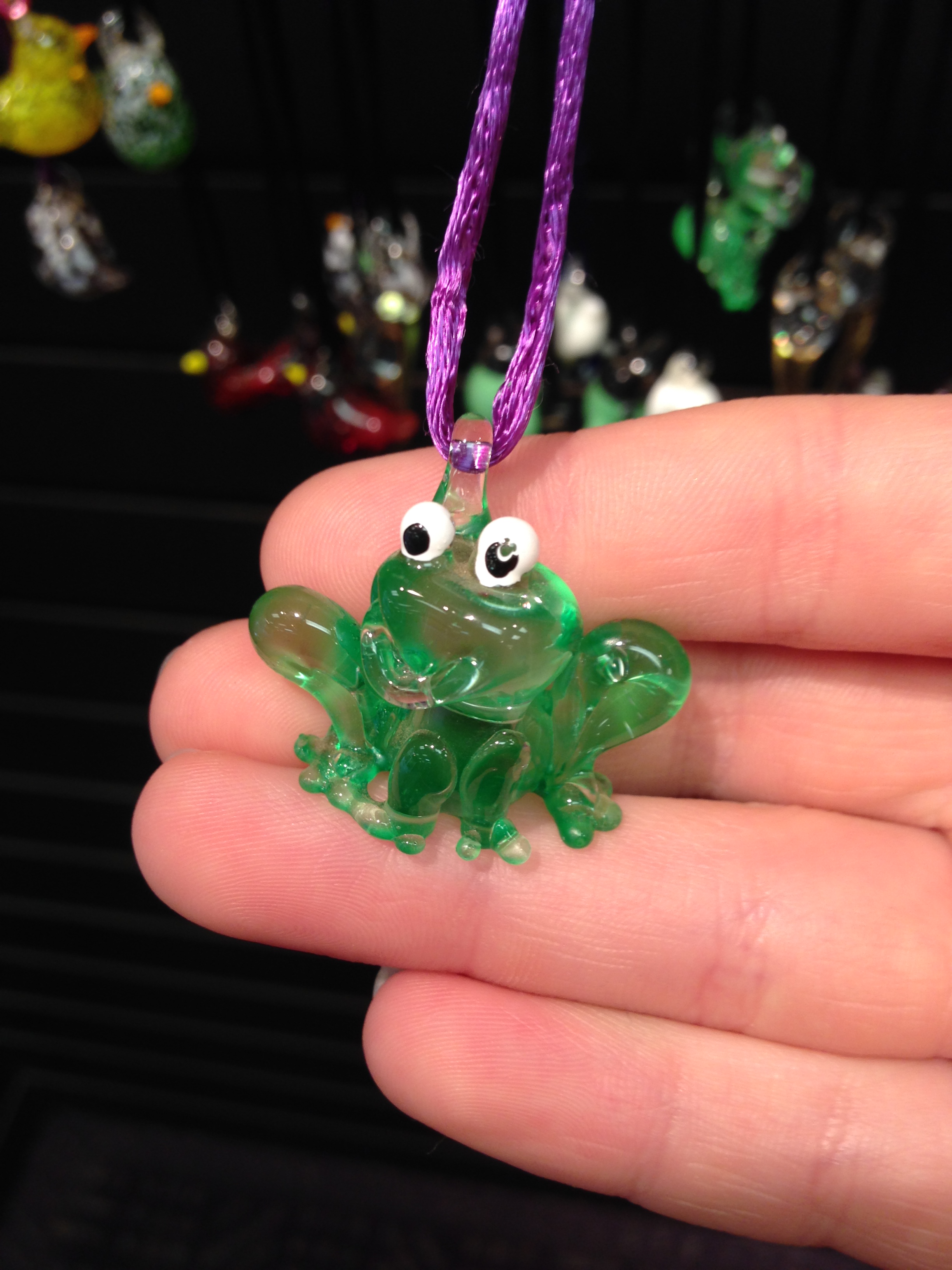 Hodgson’s studio has small, miniature pieces of glass made into animals, creatures and other delicate creations including necklaces and earrings. He challenges his customers to take a close look at the structure of the delicate glass pieces. If you look real close at blown glass you will notice most of the animals are just a teardrop. A teardrop of glass for the main body and then you add four legs. The tail dictates what the animal is. You must design so you always can hold on to that piece, still add detail to it and then usually any of that detail is brought out in the finish work when it is colder. Paint or gold is added and different things that bring the details to the surface.” Larger glass oil lamps with various blown glass figures also decorate the tables and walls of his store.