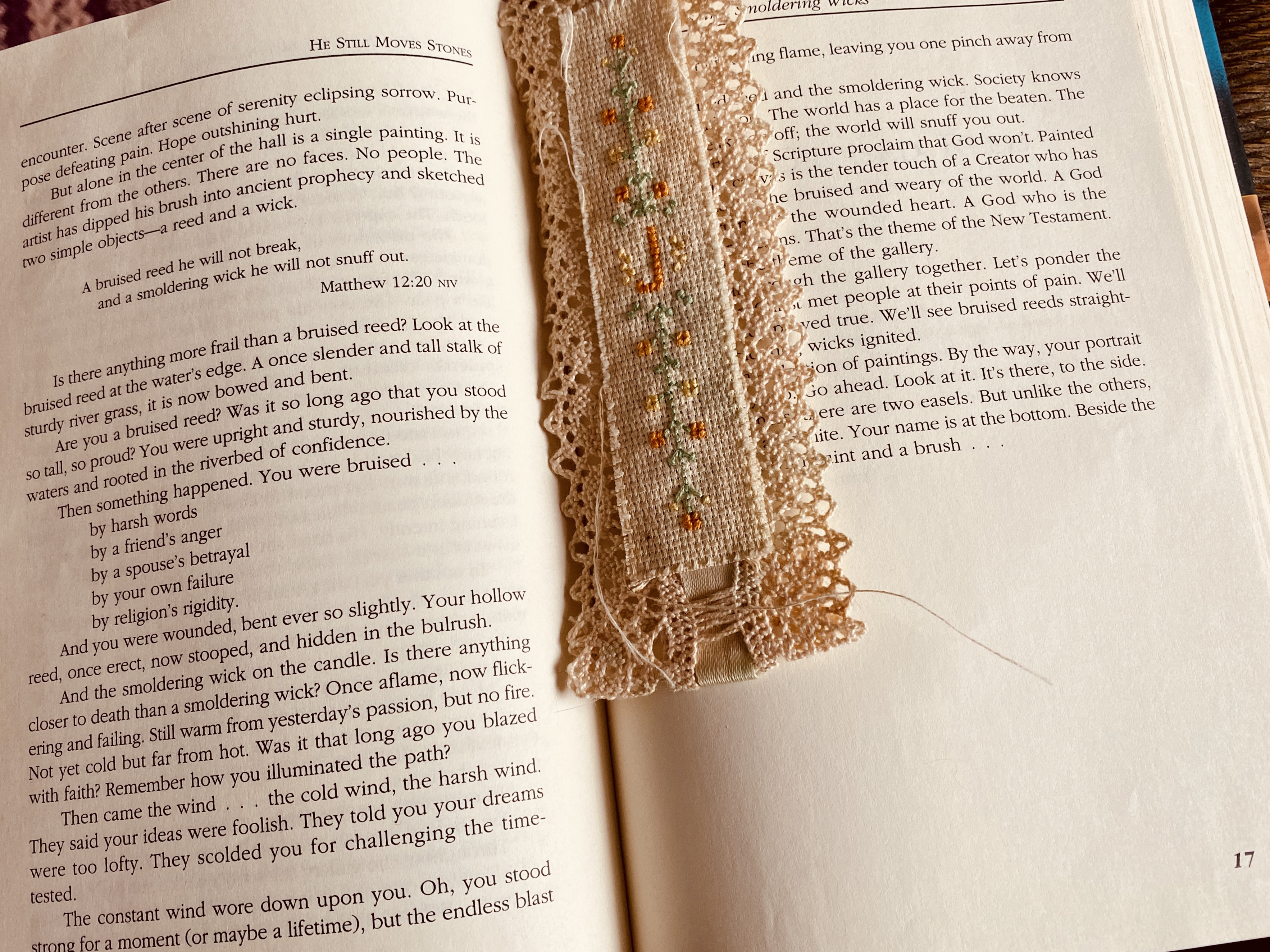 My friend Lilly made the bookmark in the picture. it is tattered and a little torn from use just as I am today. I am dictating this as I am laid up, or I should say my hand is laid up with a bent finger.