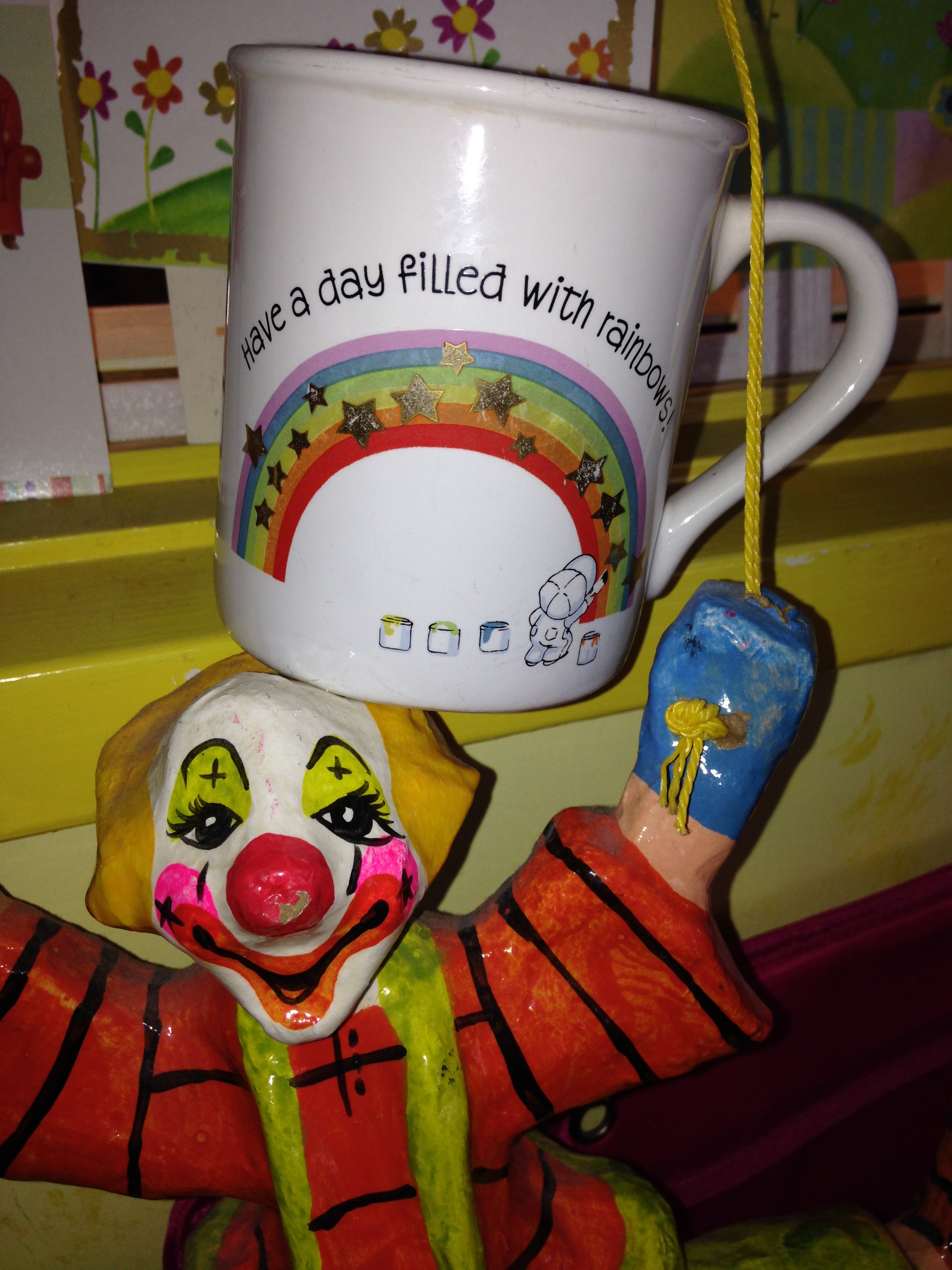 My cups remind me of friends. I received a rainbow cup from a friend that was dying of cancer. It came out of her cupboard and she knew my love of rainbows. It was her remembrance to me. I still have it and use it 25 years later. I remember my friend every time I use my cup. My friends have given me some awesome coffee cups.
